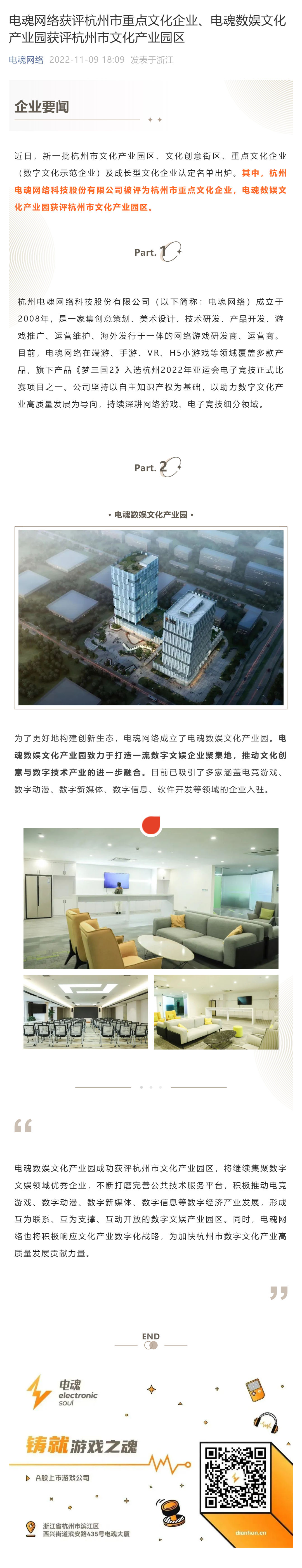 電魂網(wǎng)絡獲評杭州市重點文化企業(yè)、電魂數(shù)娛文化產(chǎn)業(yè)園獲評杭州市文化產(chǎn)業(yè)園區(qū)