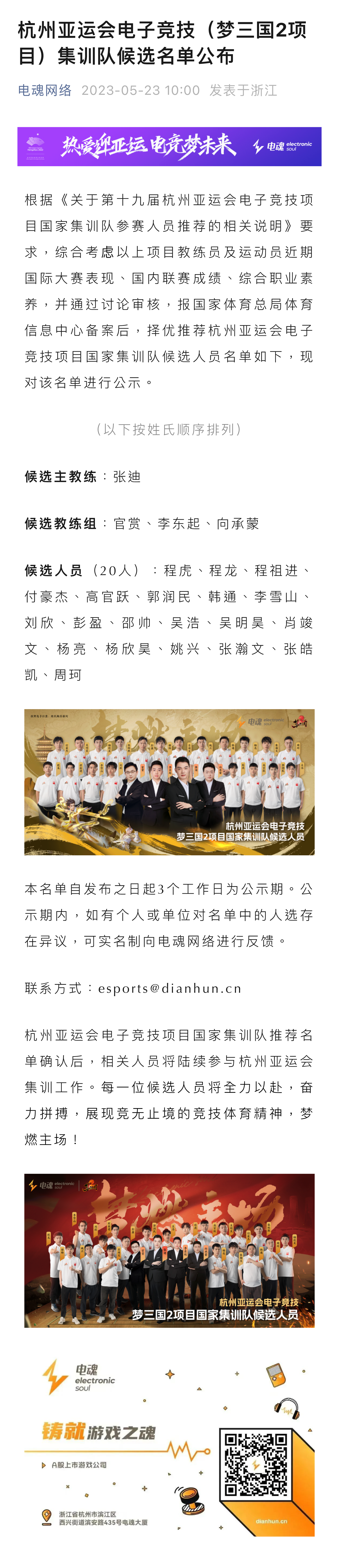 杭州亞運會電子競技(夢三國2項目)集訓隊候選名單公布