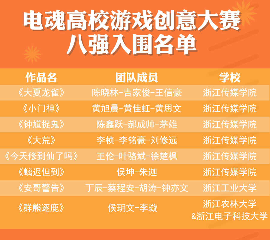 2018年6月至10月,電魂以發(fā)掘游戲人才,探索游戲創(chuàng)意為主旨,聯(lián)合杭州眾多高校,舉辦首屆電魂杯-高校游戲創(chuàng)意大賽,比賽共征集40份作品。