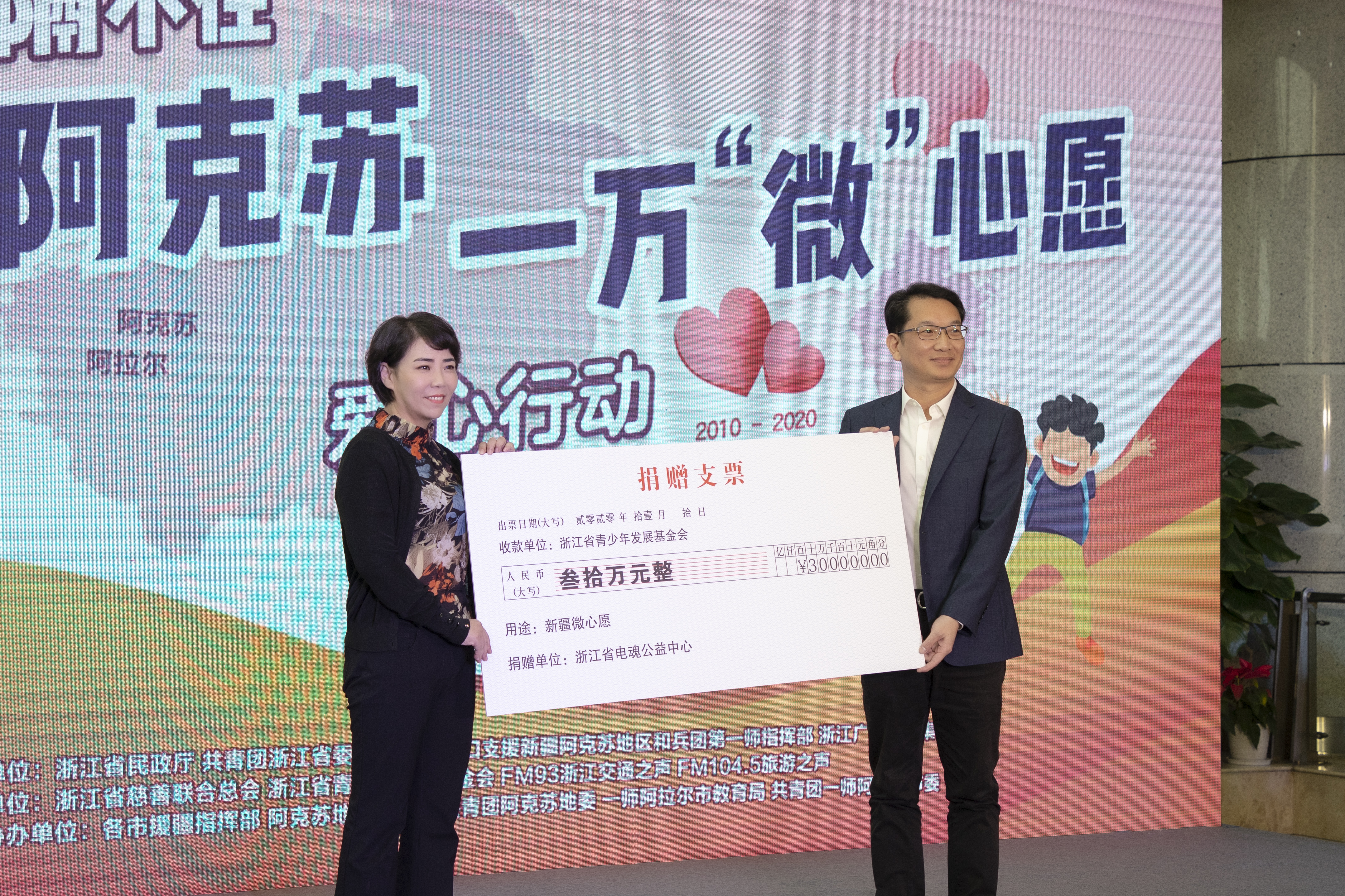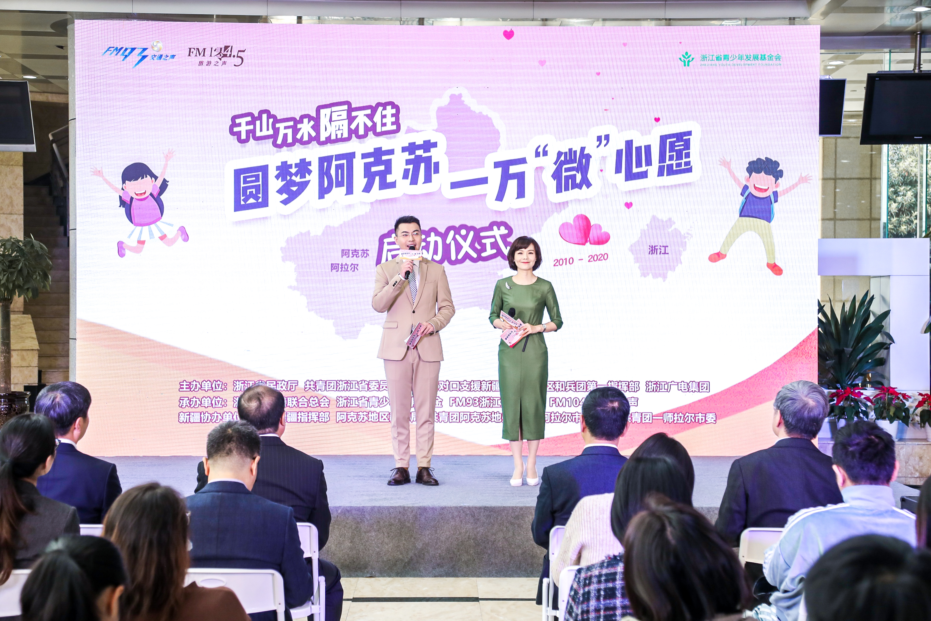 11月10日上午,“千山萬水隔不住——圓夢阿克蘇,點亮萬個‘微’心愿”啟動儀式在浙江廣電集團隆重舉行,浙江省電魂公益中心與各界愛心組織、個人參與其中,為該地區家庭經濟狀況較差的中小學生實現心愿,共同為孩子們的健康成長護航。
