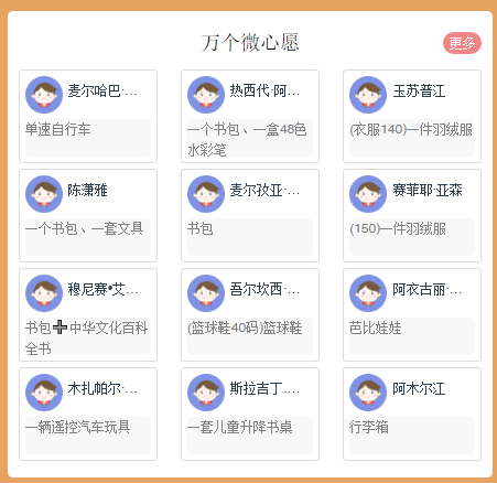 此前,主辦方對阿克蘇地區的孩子們的小愿望進行了廣泛征集,截至目前,共收到11183個微心愿,多以300元以下的生活、學習用品為主。