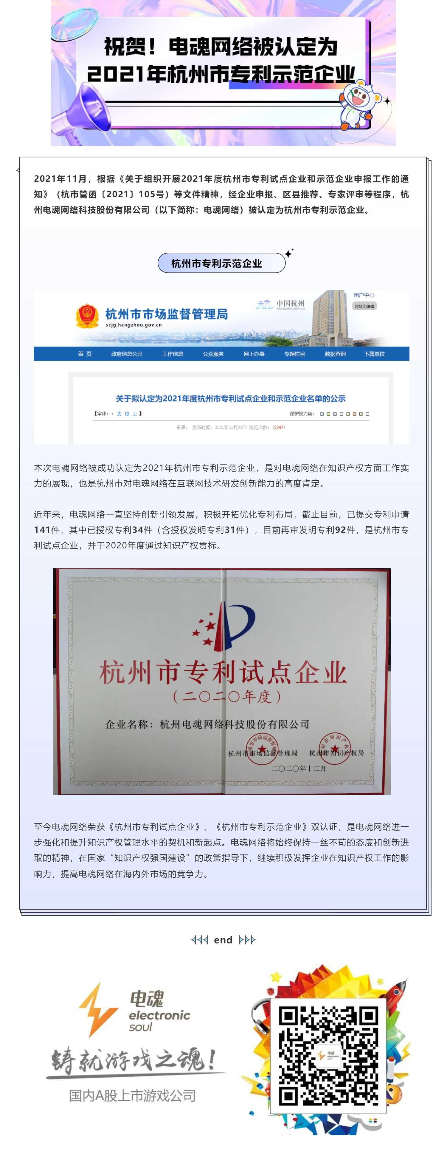 祝賀!電魂網絡被認定為2021年杭州市專利示范企業